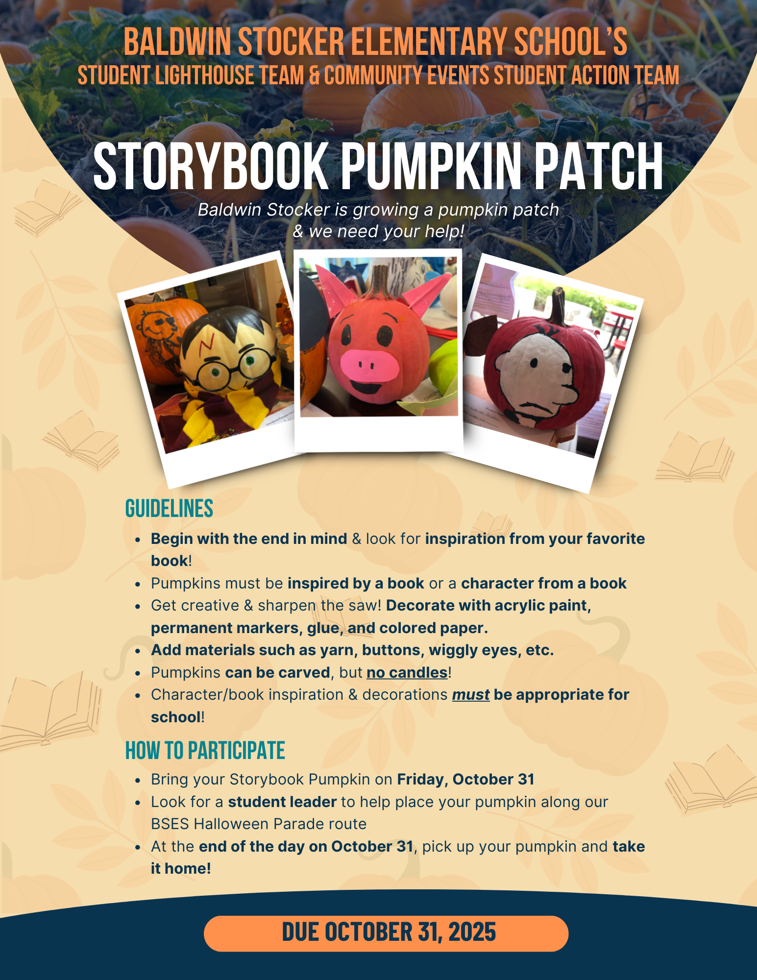 Storybook Pumpkin Patch This year's Story Book Pumpkin patch will be one day only on Friday October 31st. Click to see the flyer with more information.